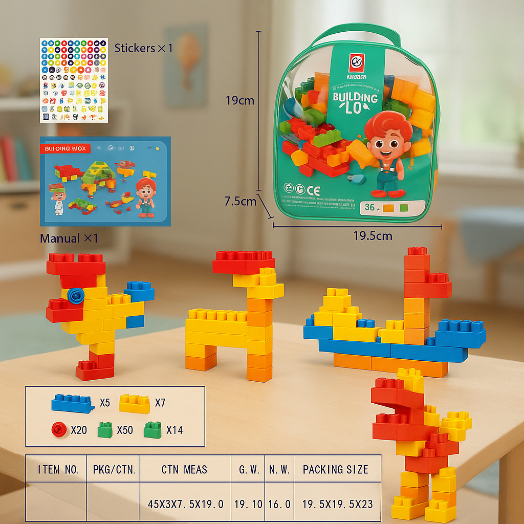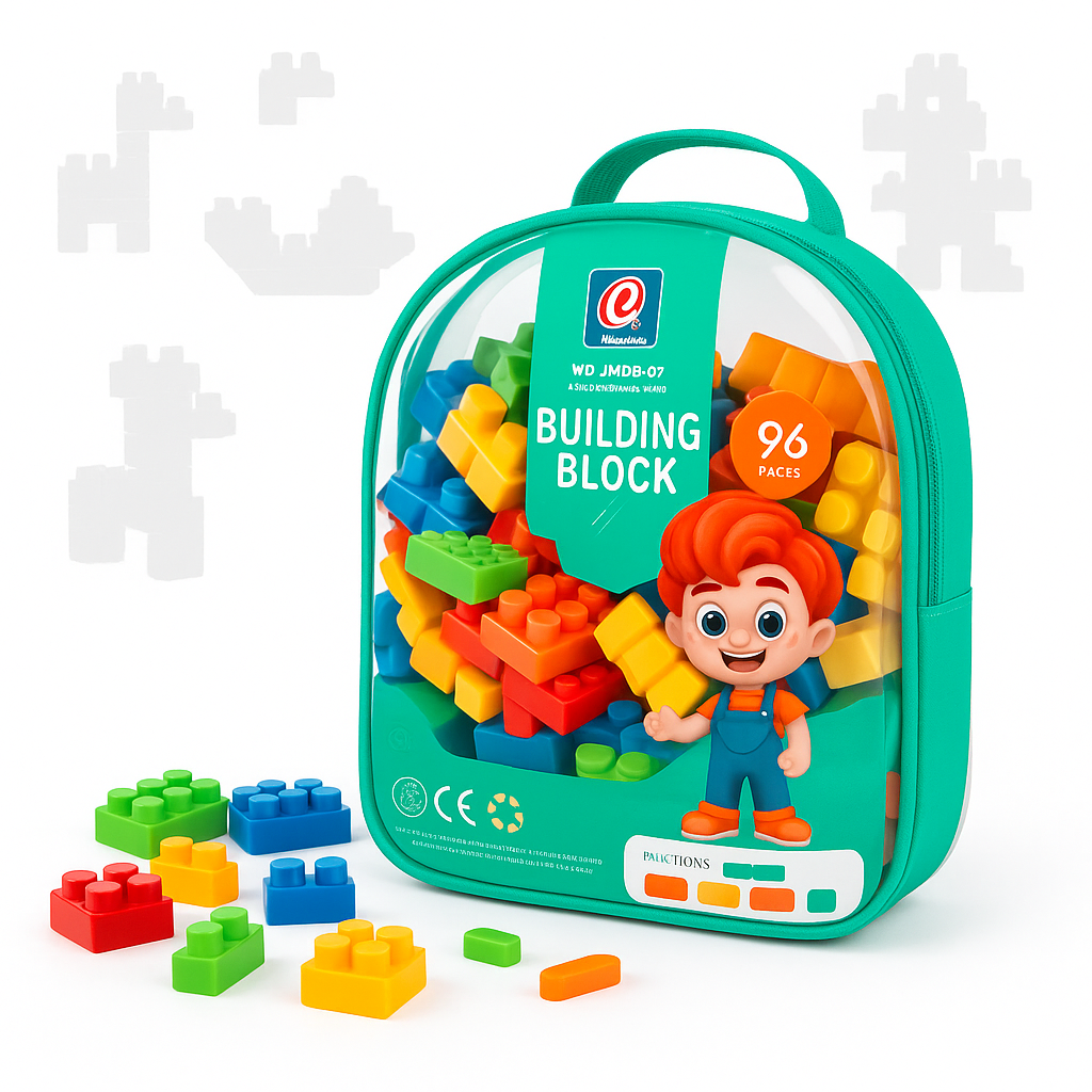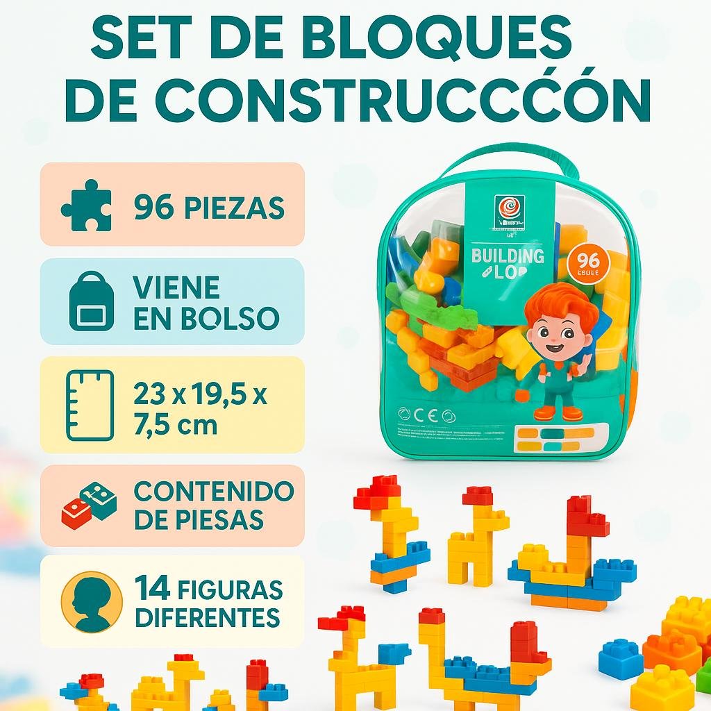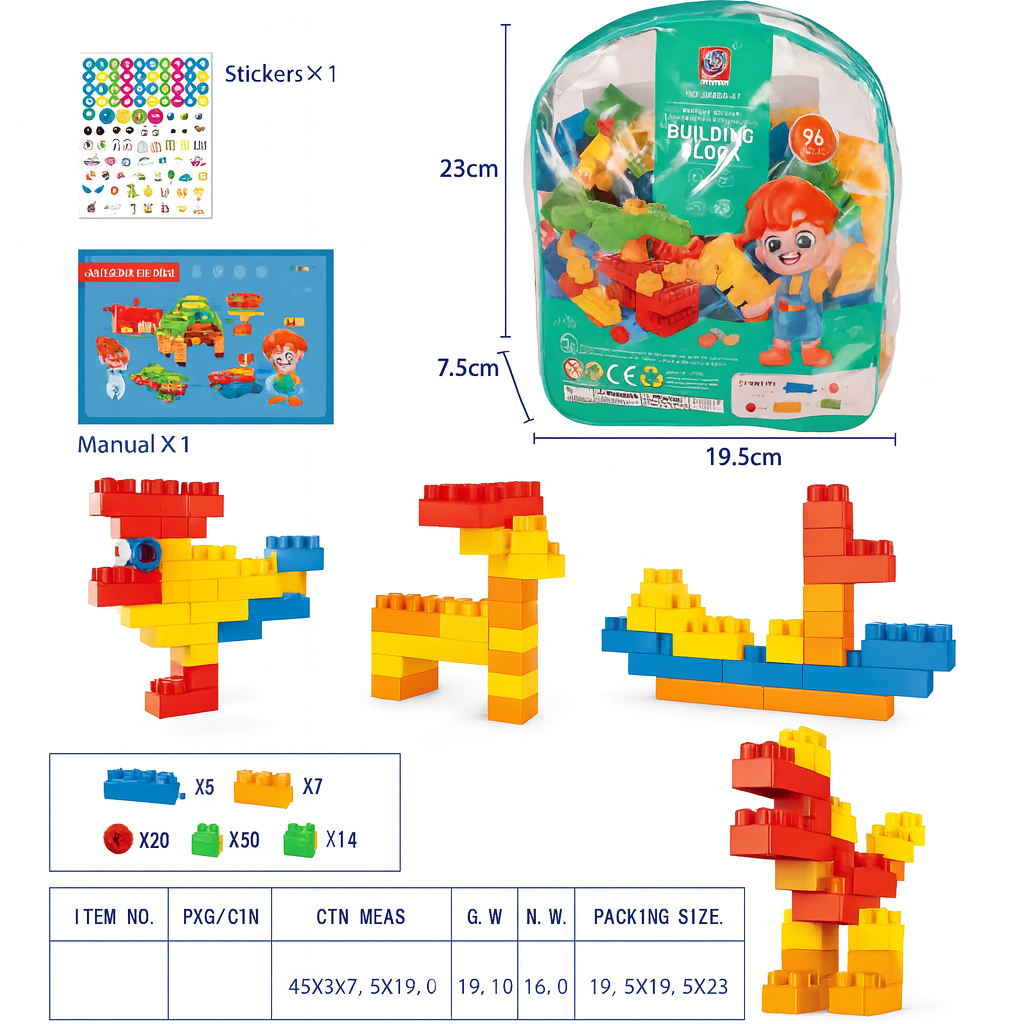 – Contiene un total de 96 piezas entre bloques de construcción y piezas tipo rompecabezas.