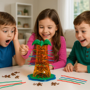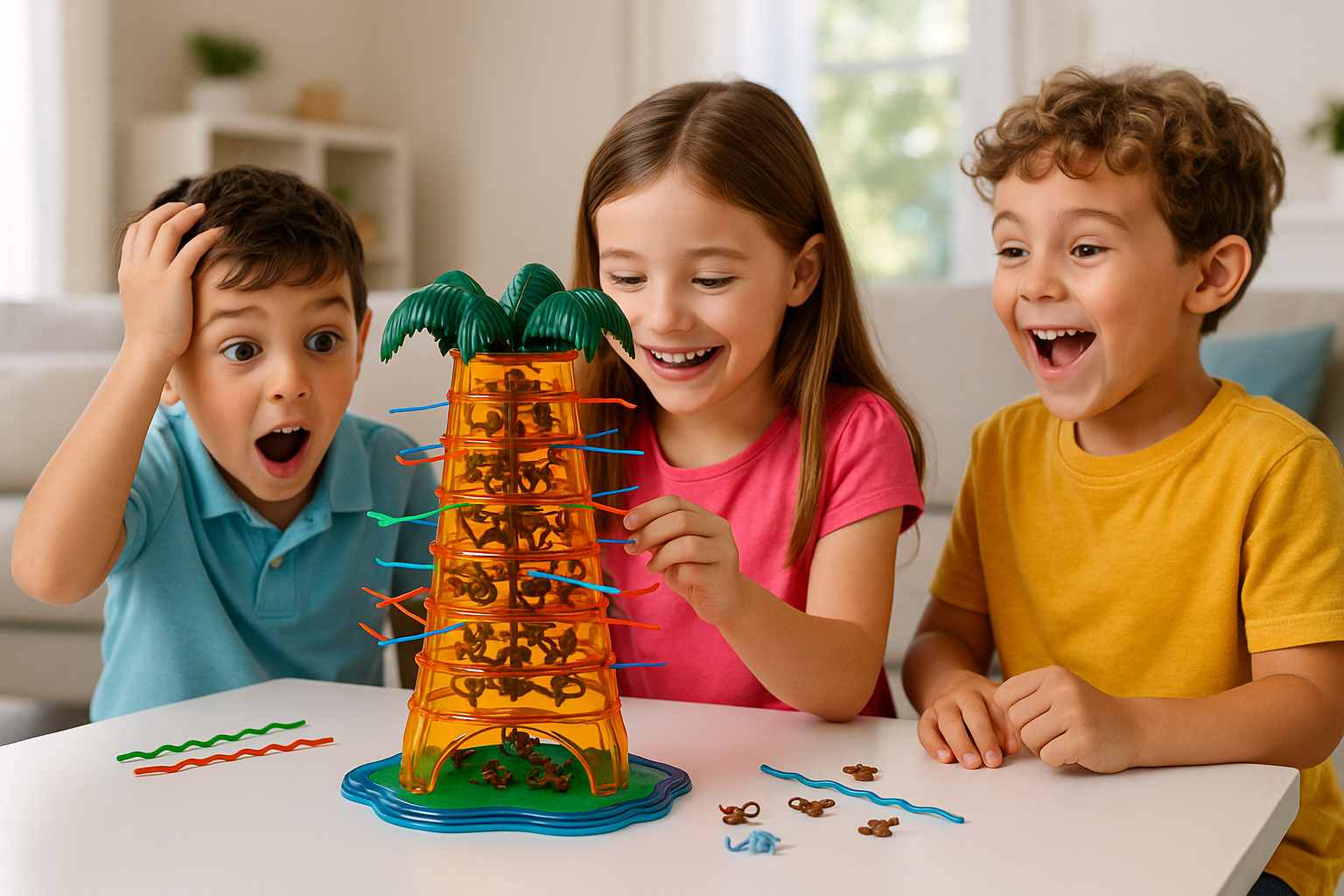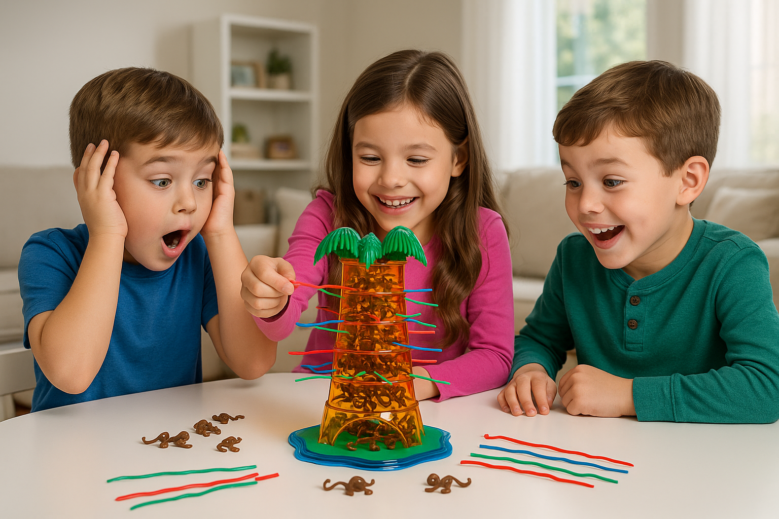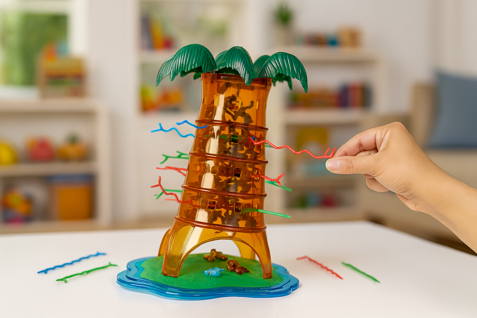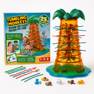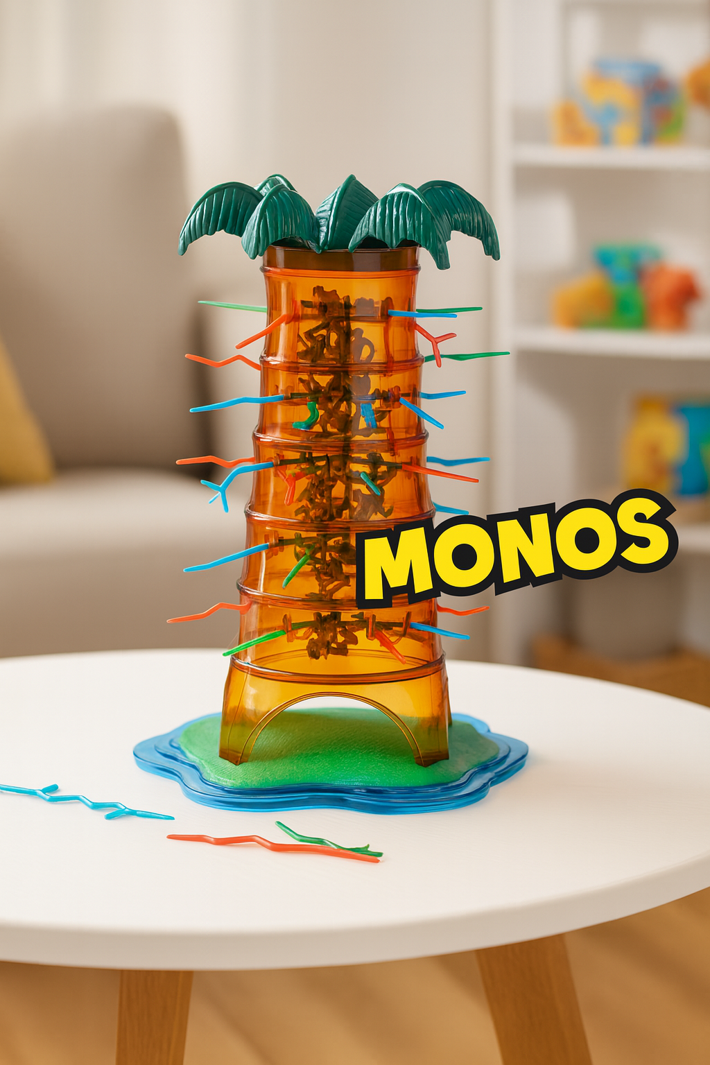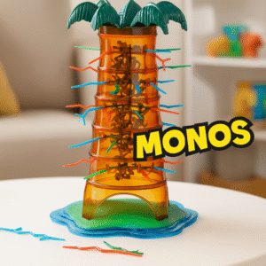 ste set incluye una estructura en forma de palmera transparente con varios niveles perforados por donde se atraviesan varillas de colores. Sobre ellas cuelgan pequeños monos que, al retirar los palitos, pueden deslizarse y caer hacia la base. El objetivo es simple: retirar las varillas estratégicamente sin dejar que los monos caigan. Cada jugador debe pensar su jugada mientras se genera un ambiente de suspenso y risas.