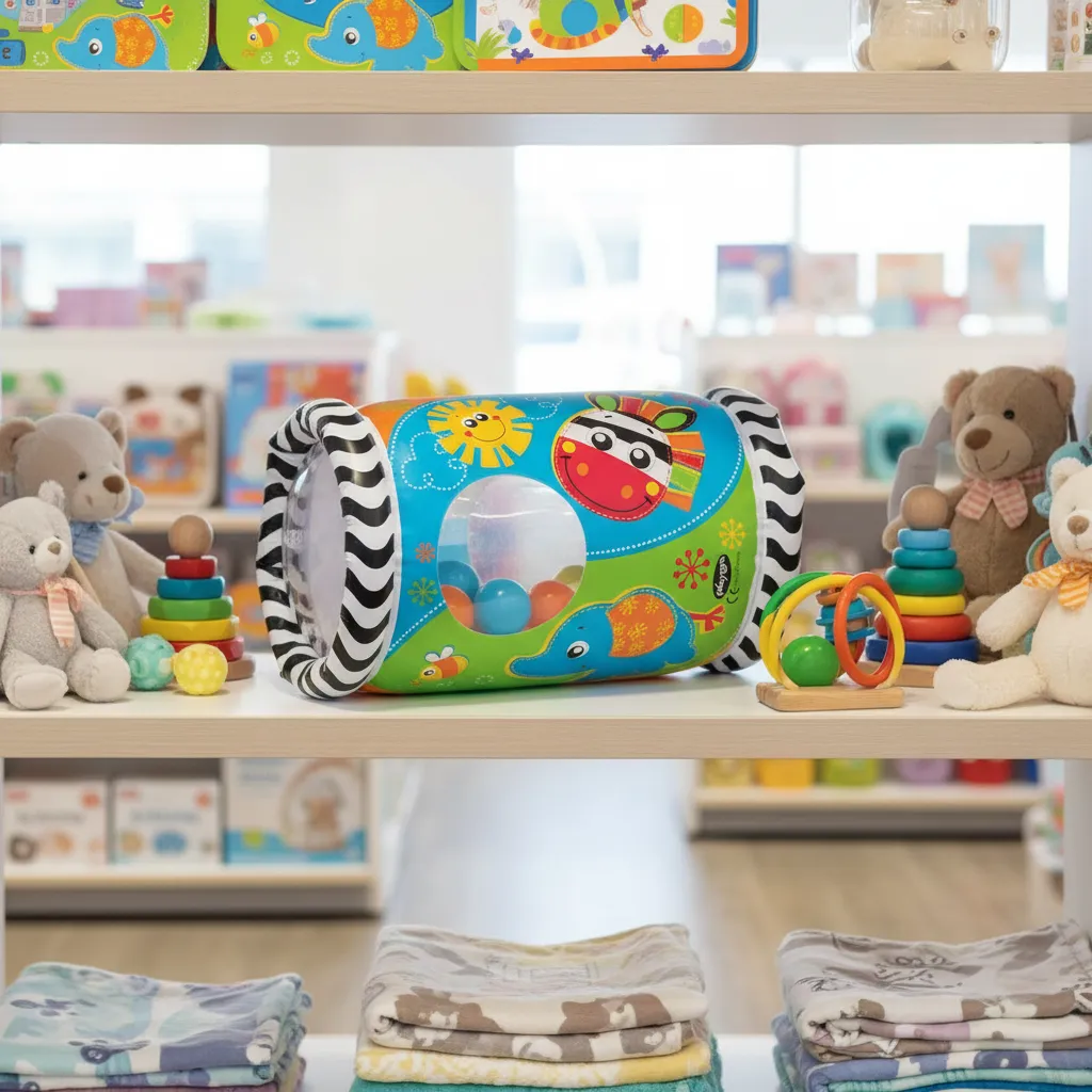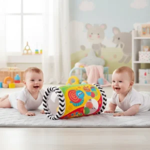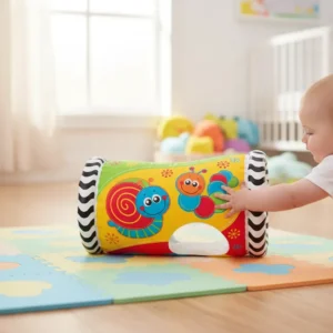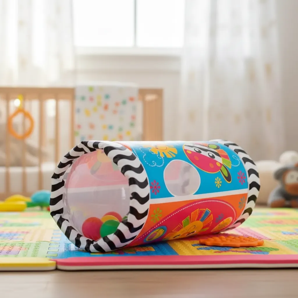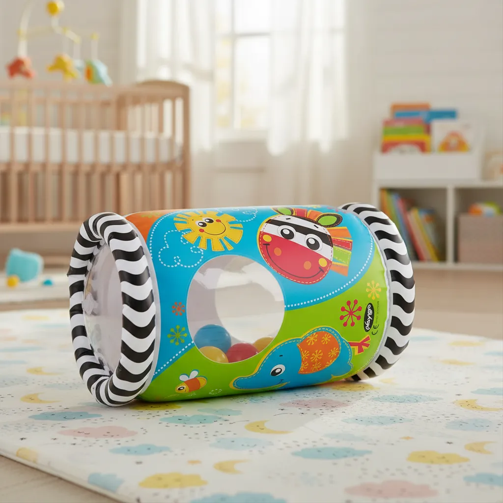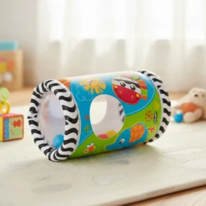 El Inflable Para Gatear Mirar y Jugar Playgro está diseñado para estimular el movimiento y el desarrollo físico de tu bebé a través del juego activo. Su formato cilíndrico inflable invita a empujar, rodar y desplazarse, incentivando el gateo y fortaleciendo la coordinación motora.