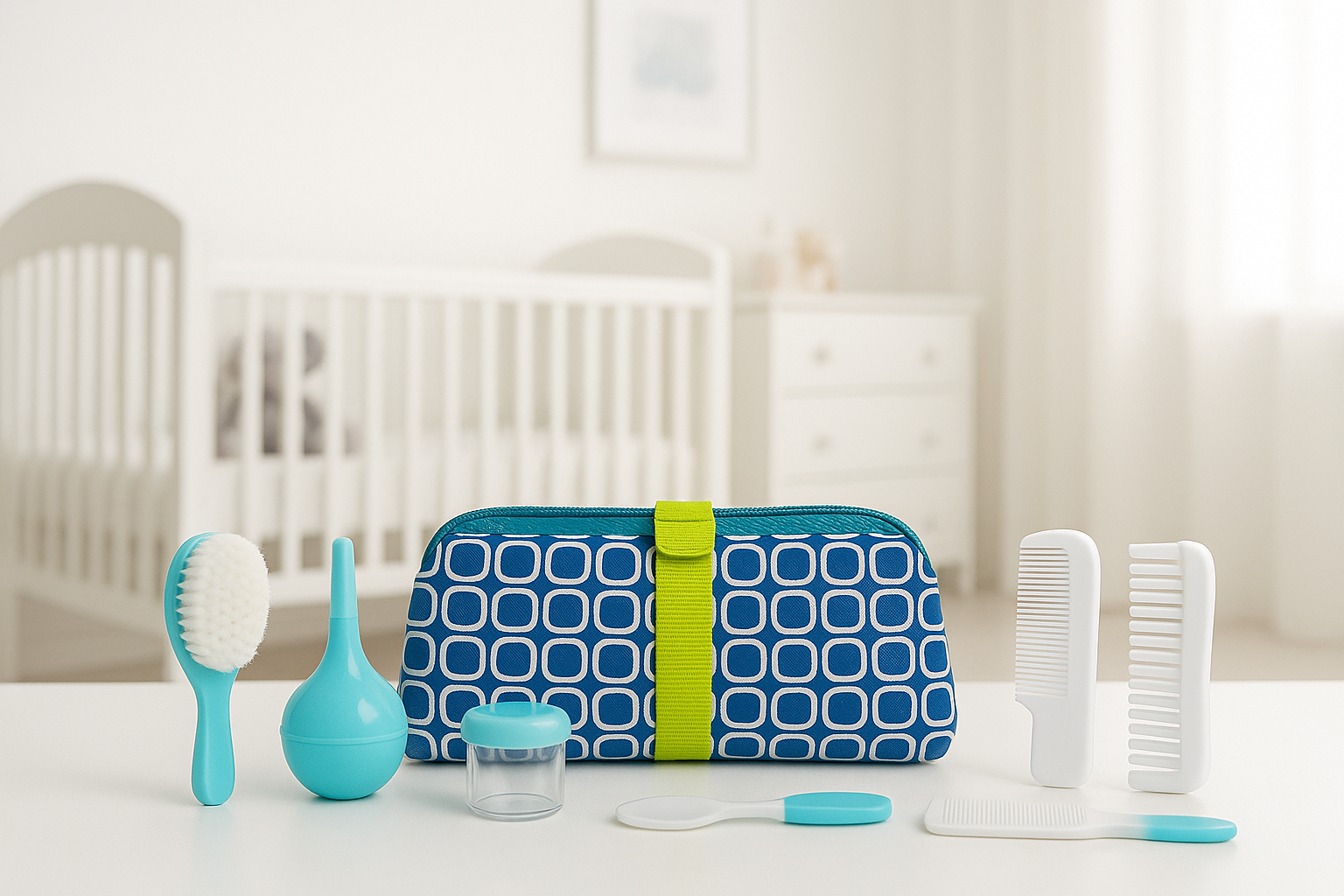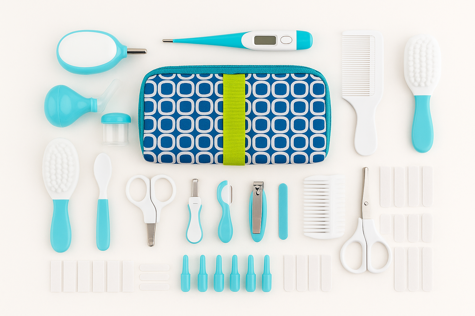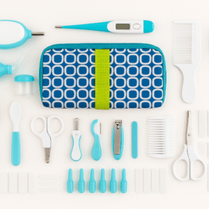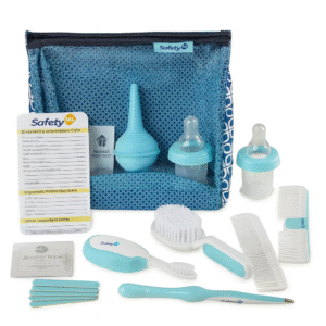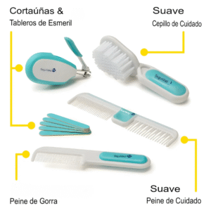 Contiene termómetro digital, cepillo de cerdas suaves, peine, tijeras de seguridad, cortauñas, gotero, aspirador nasal, cucharilla dosificadora y más.