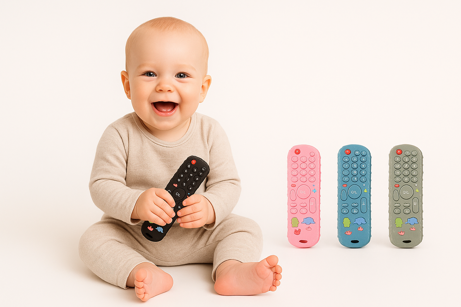 Este control remoto sensorial de silicona está diseñado especialmente para captar la atención de los bebés y ofrecerles una alternativa segura, resistente y entretenida frente a los controles reales del hogar. Su diseño realista, texturas suaves y colores modernos lo convierten en un juguete ideal para estimular el desarrollo temprano.