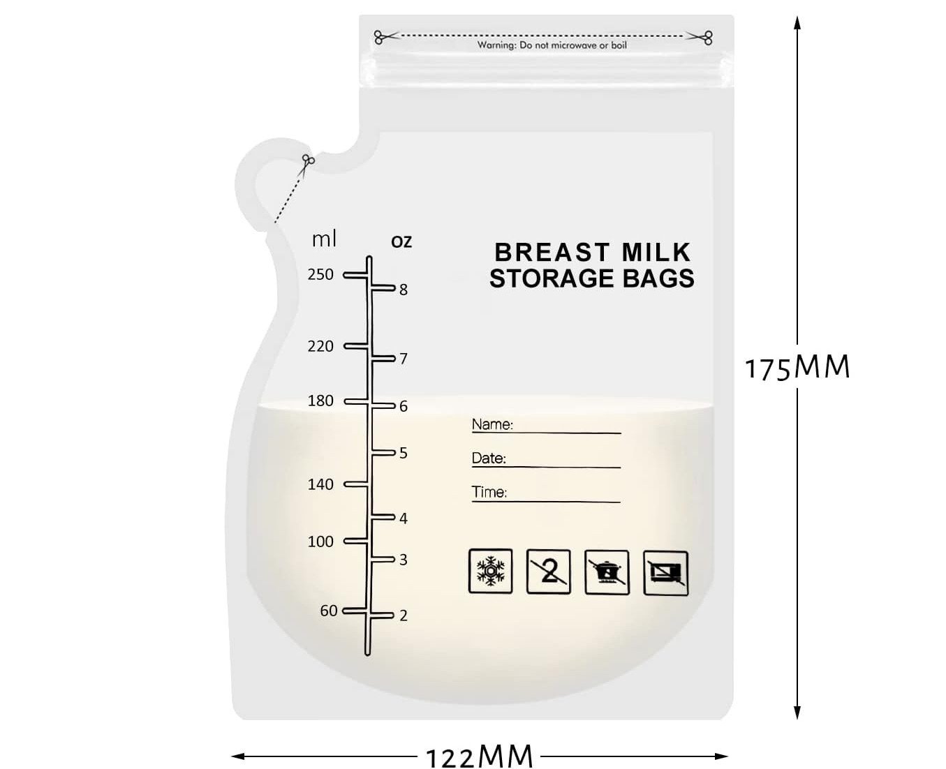 Las bolsas están diseñadas para mantenerse de pie de forma estable o para colocarse en posición horizontal, optimizando el espacio en el refrigerador o congelador. Su boquilla lateral facilita el vertido directo al biberón, minimizando derrames y contacto con el exterior.