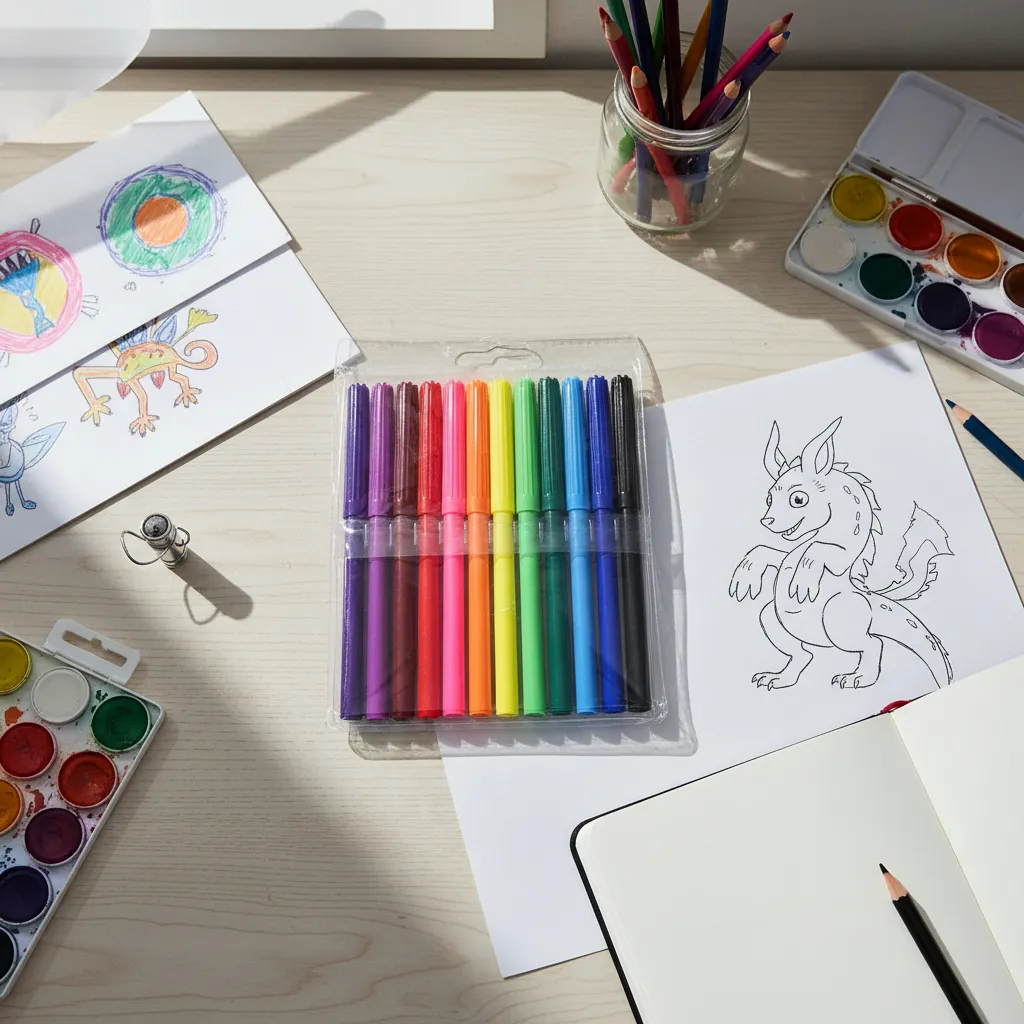 Los Plumones o Marcadores Escolares Lavables Set 12 Unids de Murano son la herramienta ideal para estudiantes y creativos. Diseñados específicamente para el uso escolar, estos marcadores ofrecen una experiencia de escritura fluida y vibrante en una variedad de superficies como papel, cartulina y cuadernos. Su punta redonda permite un grosor de trazo de 1.0 a 2.0 mm, lo que los hace perfectos para dibujar, colorear y escribir.