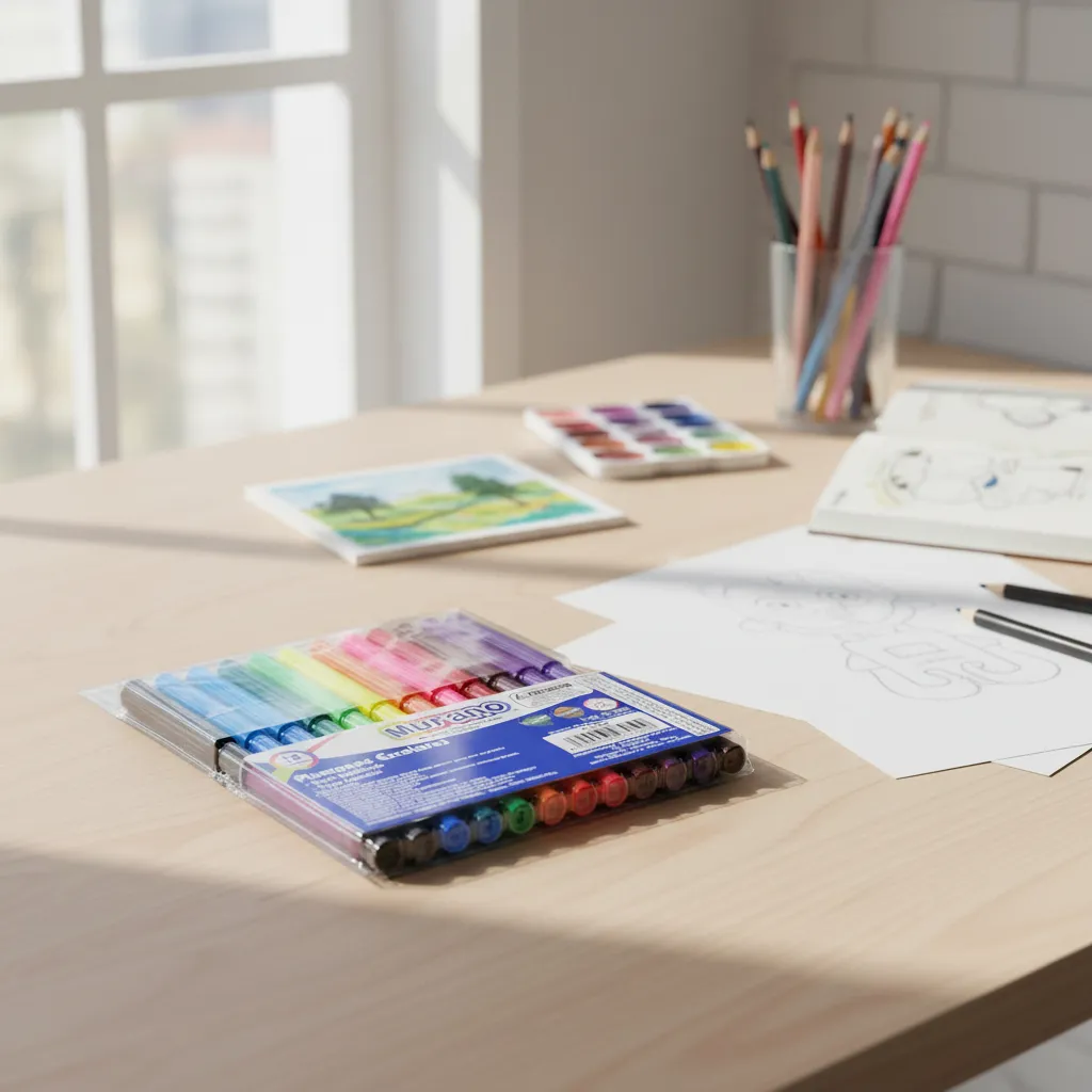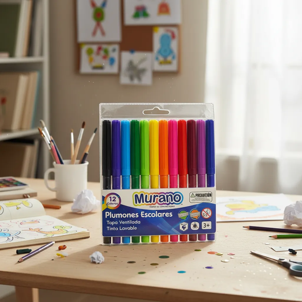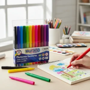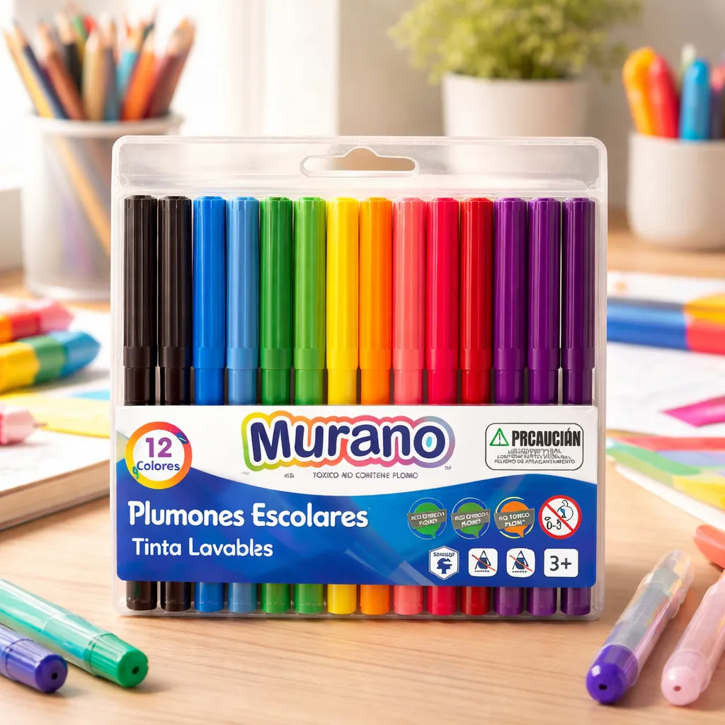 Este set incluye 12 colores variados, lo que estimula la creatividad y permite a los estudiantes expresar su imaginación sin límites. Ya sea para proyectos escolares, tareas o actividades artísticas, estos plumones son una elección confiable que combina calidad y funcionalidad. Con Murano, cada trazo cuenta y cada color cobra vida.